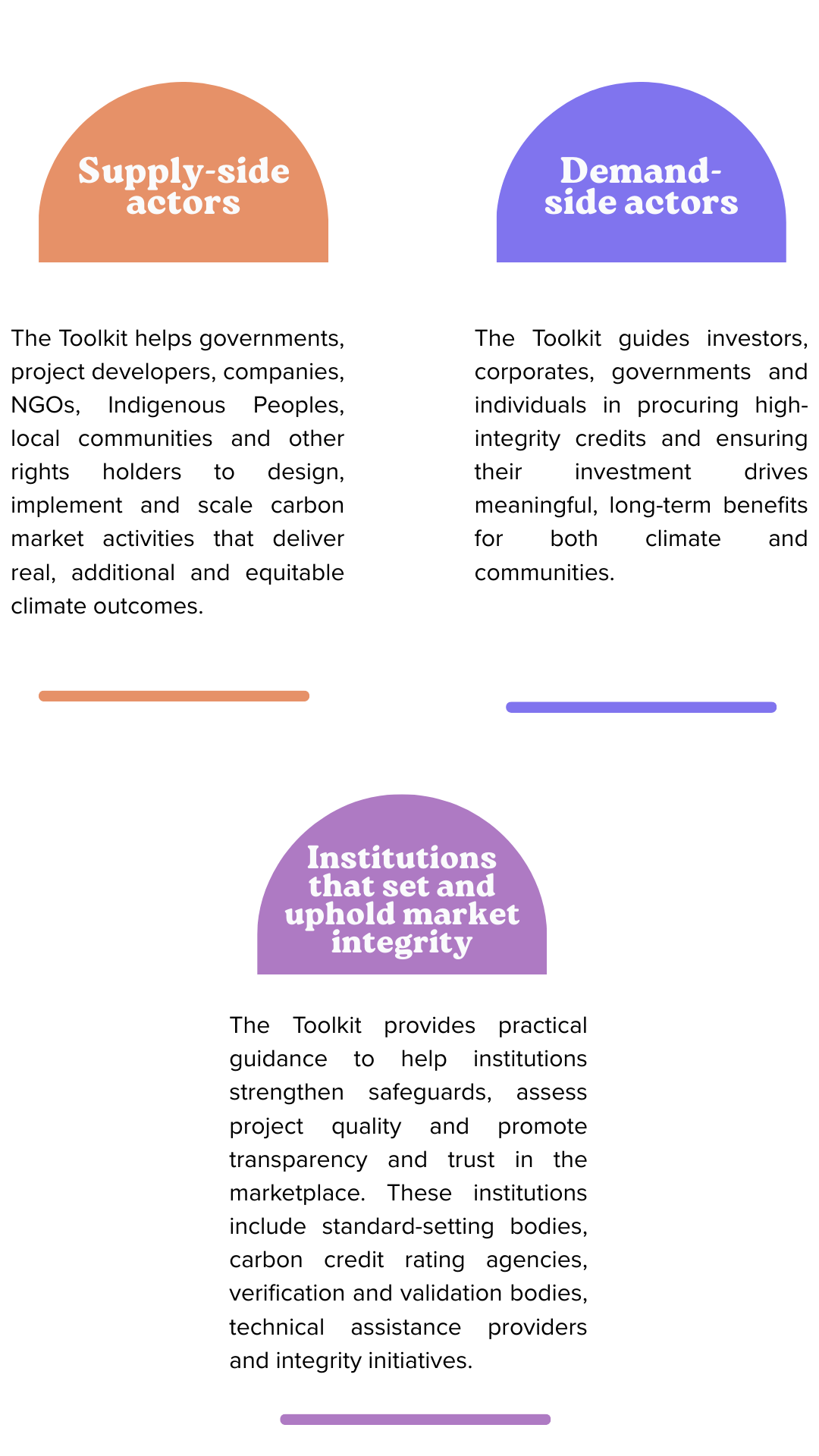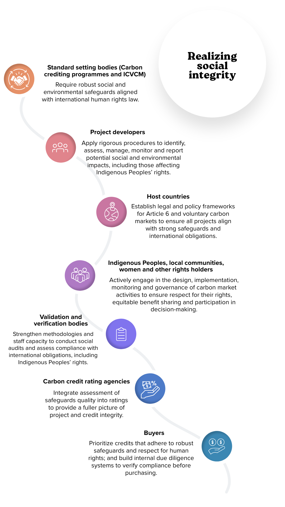 Achieving high social integrity requires every actor to raise their standards and work in coordination. Governments, standard-setters, project developers, investors, civil society and local communities each have a role to play in ensuring that safeguards are not only embedded in policy but effectively implemented in practice. Together, these actors form an integrity ecosystem—a shared framework of accountability that prevents harm, minimizes risks and maximizes benefits. The Toolkit advances key actors’ longer-term social integrity objectives.